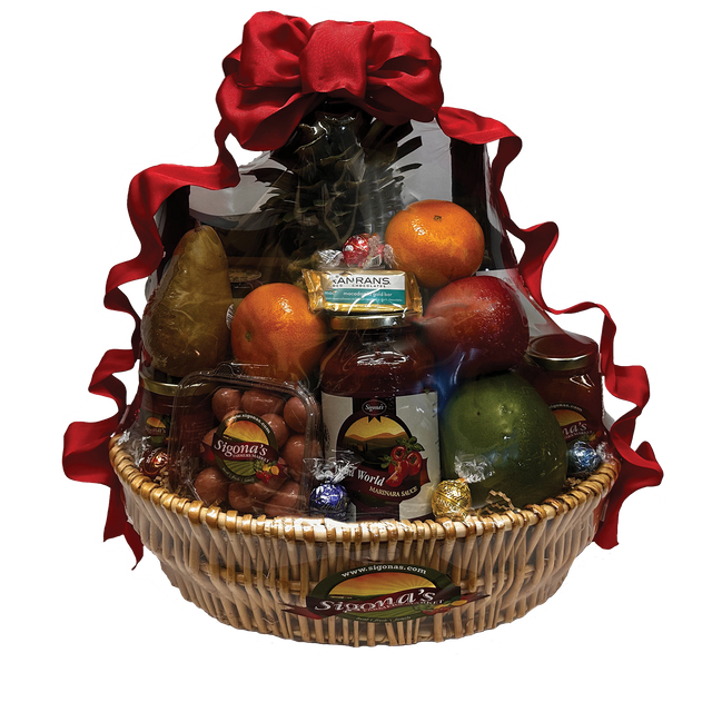 This basket is a collection of some of the Sigona brothers’ favorites. It’s a fantastic combination of the finest, hand-picked, seasonal fruits and great tasting gourmet items. Delicious chocolates, smoked salmon, jam, tea, 12-year aged balsamic vinegar, Fresh Press extra virgin olive oil, crackers and Sigona’s Old World Marinara.