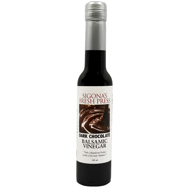 This dark chocolate balsamic is rich, thick and resounds with complexity. It contains a trio of fine chocolate: Valrhona, Callebaut and Guittard, all recognized by the pastry chefs as the finest in the world.