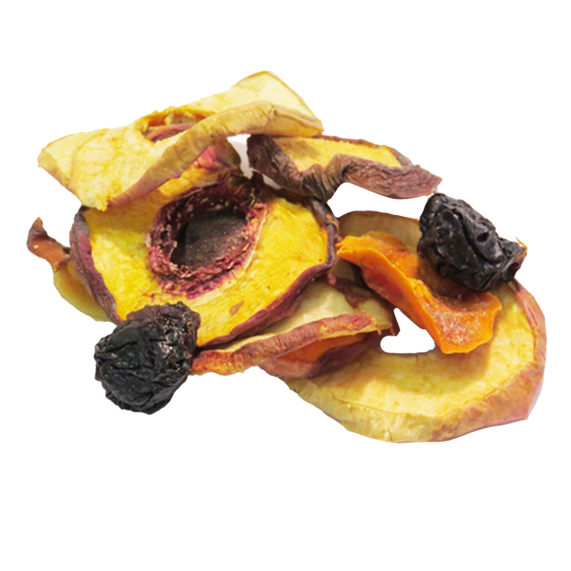 May include some or all of the following: dried white peaches, dried yellow peaches, dried Bartlett pears, dried natural Granny Smith apples, dried Hachiya persimmons, natural pitted prunes.