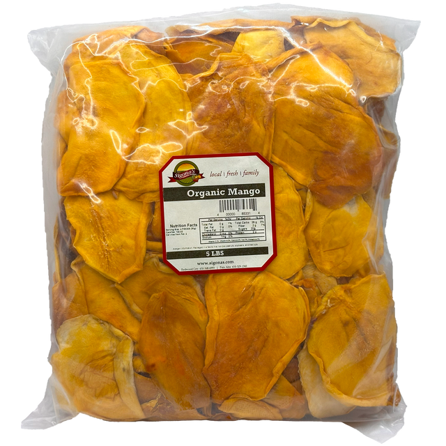 Our organic, dried mango is by far the most popular seller. This delicious treat is simply irresistible! It's organic, no sugar, no nothing added--simply plain dried mango.