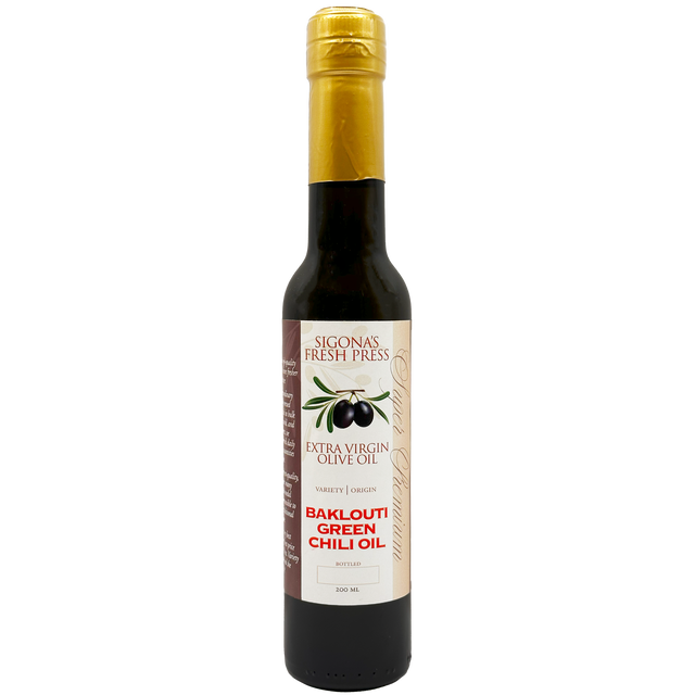 This oil is a fused oil, rather than infused, meaning it is made by combining fresh, early harvest, organic olives with an almost equal ratio of fresh, whole green Baklouti chilies. The two, and only two, ingredients are then crushed together and mixed in the malaxer, which fuses the fresh green essential oil of the pepper with the olive oil.