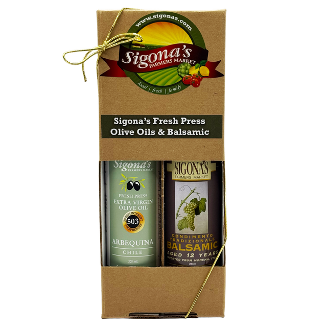 Our barrel-aged traditional style balsamic & our Arbequina extra virgin olive oil are ready for gifting with this beautiful box.