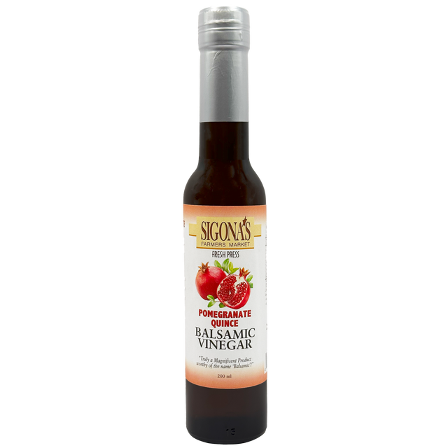 This beautiful, ruby jewel-toned white balsamic owes its tart, crisp flavor to juicy California pomegranates and floral winter quince. It's made from authentic white balsamic condimento, aged for 12 years in Modena, Italy.